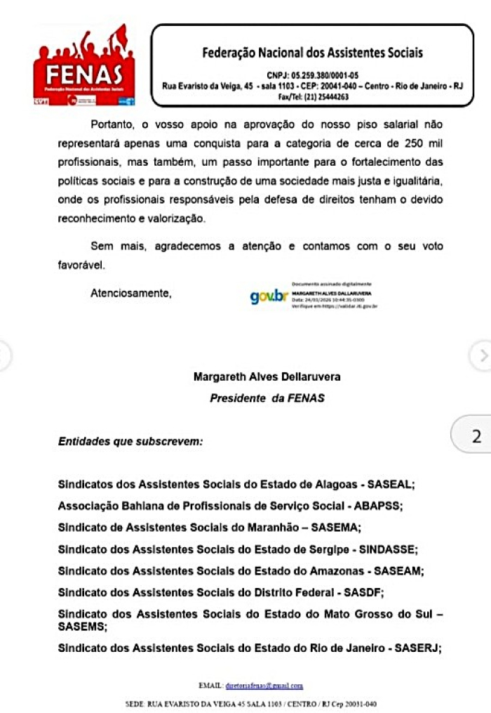 Esta luta histórica da categoria, estimada em cerca de 250 mil profissionais, para ver aprovado o piso salarial nacional está entre as prioridades da Confederação e da FENAS. Trata-se da correção de uma injustiça histórica que penaliza os assistentes sociais, que merecem essa valorização, mas também é, como cita o documento da Federação, “um passo importante para o fortalecimento das políticas sociais e para a construção de uma sociedade mais justa e igualitária, onde os profissionais responsáveis pela defesa de direitos tenham o devido reconhecimento e valorização”.