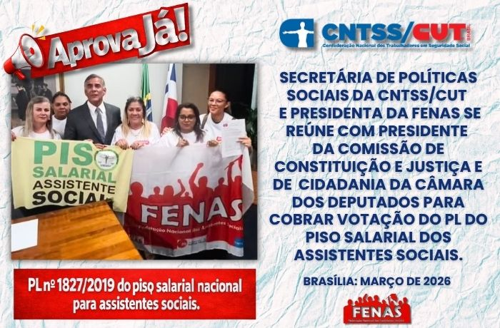 A partir de uma agenda intensificada em Brasília, de 24 a 26 de março, lideranças da Confederação Nacional dos Trabalhadores em Seguridade Social (CNTSS/CUT) e da Federação Nacional dos Assistentes Sociais (FENAS), entidade filiada à Confederação, buscaram dialogar com parlamentares com a finalidade de consolidar apoio para a votação e aprovação do Projeto de Lei nº 1827/2019, que trata do piso salarial nacional para assistentes sociais, assim como das demais pautas de interesse da categoria.