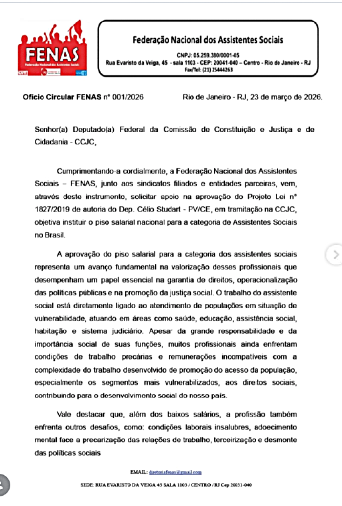 No contato com os deputados, a FENAS tem distribuído um documento assinado por entidades nacionais de trabalhadores, entre elas a CNTSS/CUT, e centrais sindicais, solicitando apoio para aprovação do PL nº 1827/2019, como forma de garantir a valorização desses profissionais, que desempenham importante papel na execução das políticas públicas e na promoção da justiça social estabelecidas no Sistema Único de Assistência Social (SUAS).