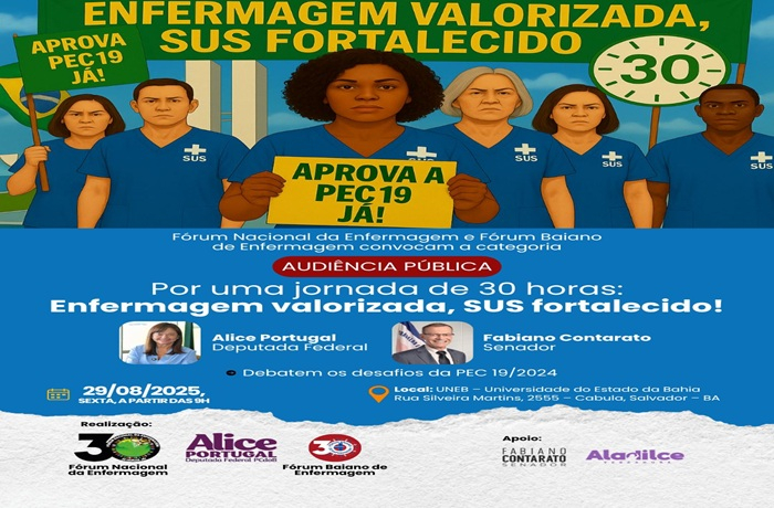 A Proposta de Emenda à Constituição (PEC) nº 19/2024, que determina que o piso salarial dos enfermeiros, técnicos de enfermagem, auxiliares de enfermagem e parteiras refere-se a uma jornada máxima de trabalho de trinta horas semanais, será tema de audiência pública na Universidade do Estado da Bahia (UNEB), em Salvador, nesta sexta-feira, 29 de agosto, a partir das 9h. Com o tema “Por uma jornada de 30 horas: Enfermagem valorizada, SUS fortalecido”, o evento reunirá profissionais, estudantes, lideranças políticas e entidades representativas para discutir os trâmites envolvendo a PEC.