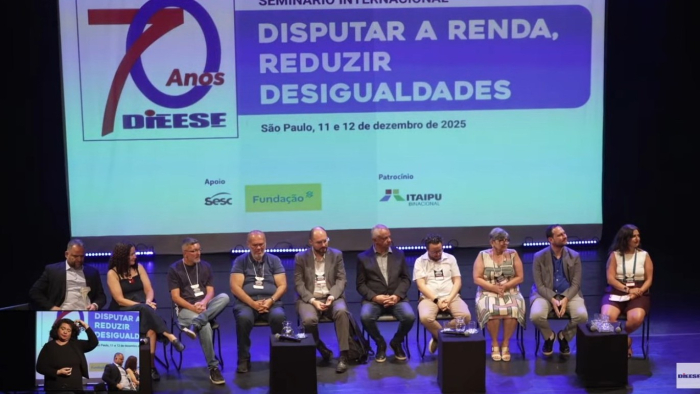 Criado em 22 de dezembro de 1955, o Departamento Intersindical de Estatística e Estudos Socioeconômicos (DIEESE) completa 70 anos, e o “Seminário Internacional Disputar a Renda, Reduzir Desigualdades” reúne lideranças sindicais para marcar o início da agenda de comemorações. A secretária de Comunicação da Confederação Nacional dos Trabalhadores em Seguridade Social (CNTSS/CUT) e atual vice-presidenta do DIEESE, Maria Godoy de Faria, acompanhou a atividade realizada em São Paulo, nos dias 11 e 12. Com a participação de cerca de 300 pessoas, o Seminário teve sua abertura oficial realizada pela diretora-técnica do Instituto, Adriana Marcolino.